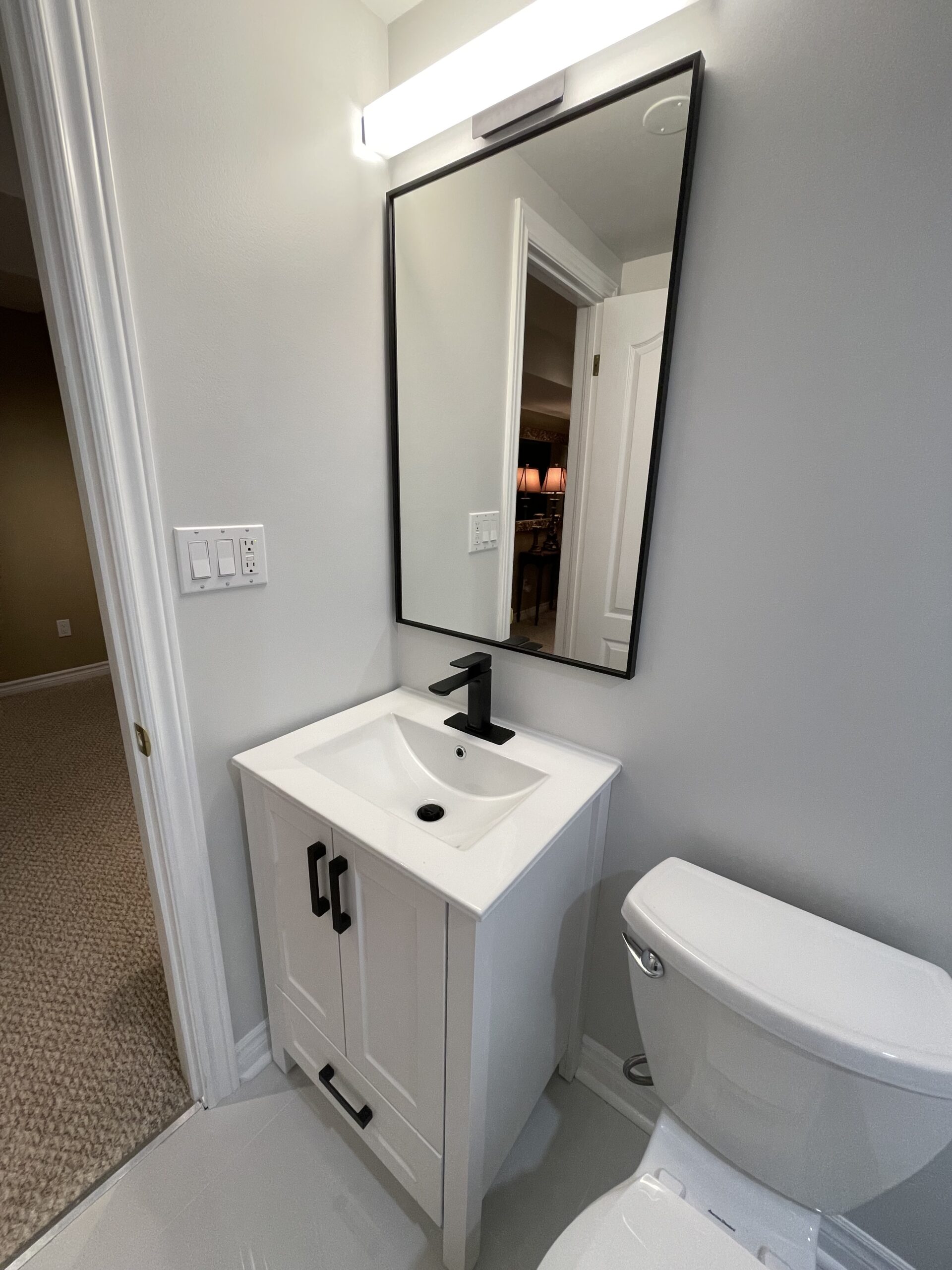 We decided to renovate all three of their bathrooms, but we strategically started with the basement bathroom. Originally, this space only had a toilet and a vanity. However, the home’s builder had left the